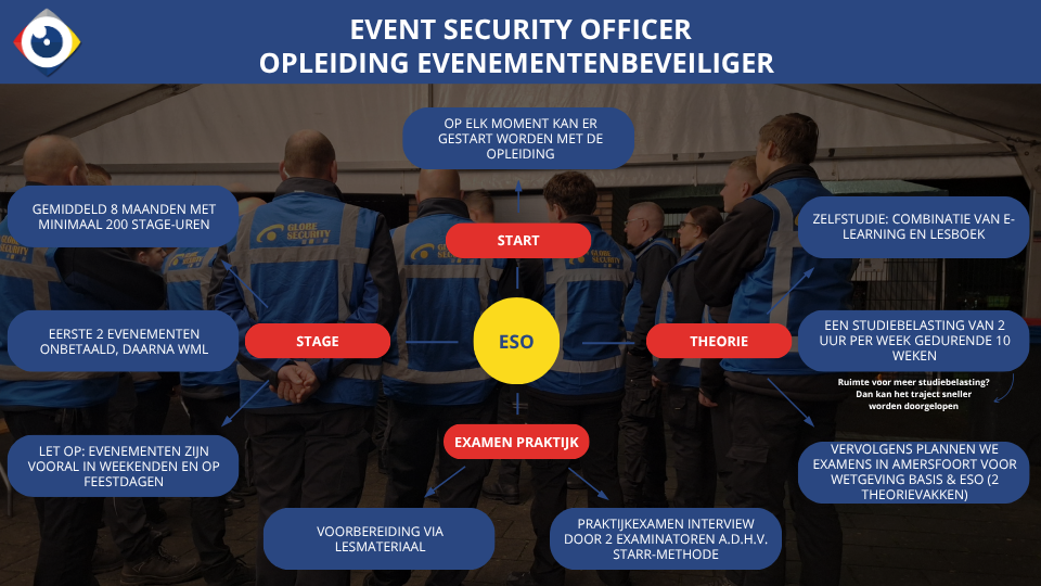 Werk je al, maar wil je iets nieuws doen dat energie geeft én impact maakt? Dan is de Event Security Officer (ESO) opleiding iets voor jou. Deze opleiding is perfect te combineren met je huidige baan en bereid je voor op een rol als evenementenbeveiliger. Je staat samen met je collega’s in het hart van festivals, sportwedstrijden en andere evenementen, waar gastvrijheid en veiligheid hand in hand gaan.